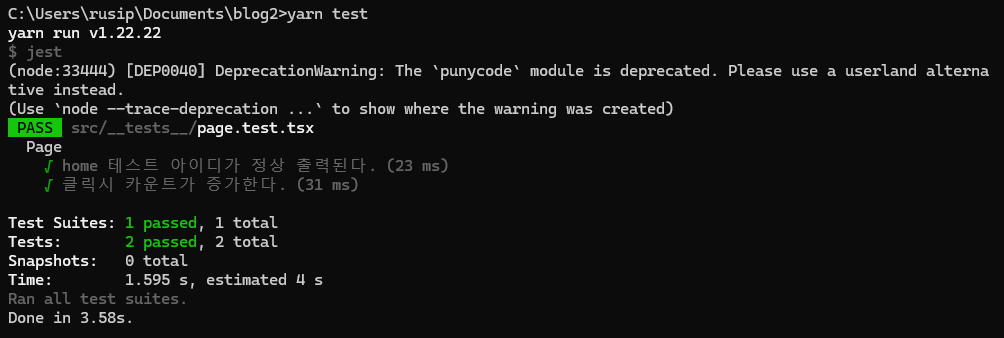 pnpm run test 명령어를 입력하면 정상적으로 테스트가 동작한다.